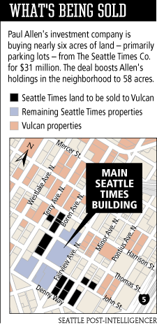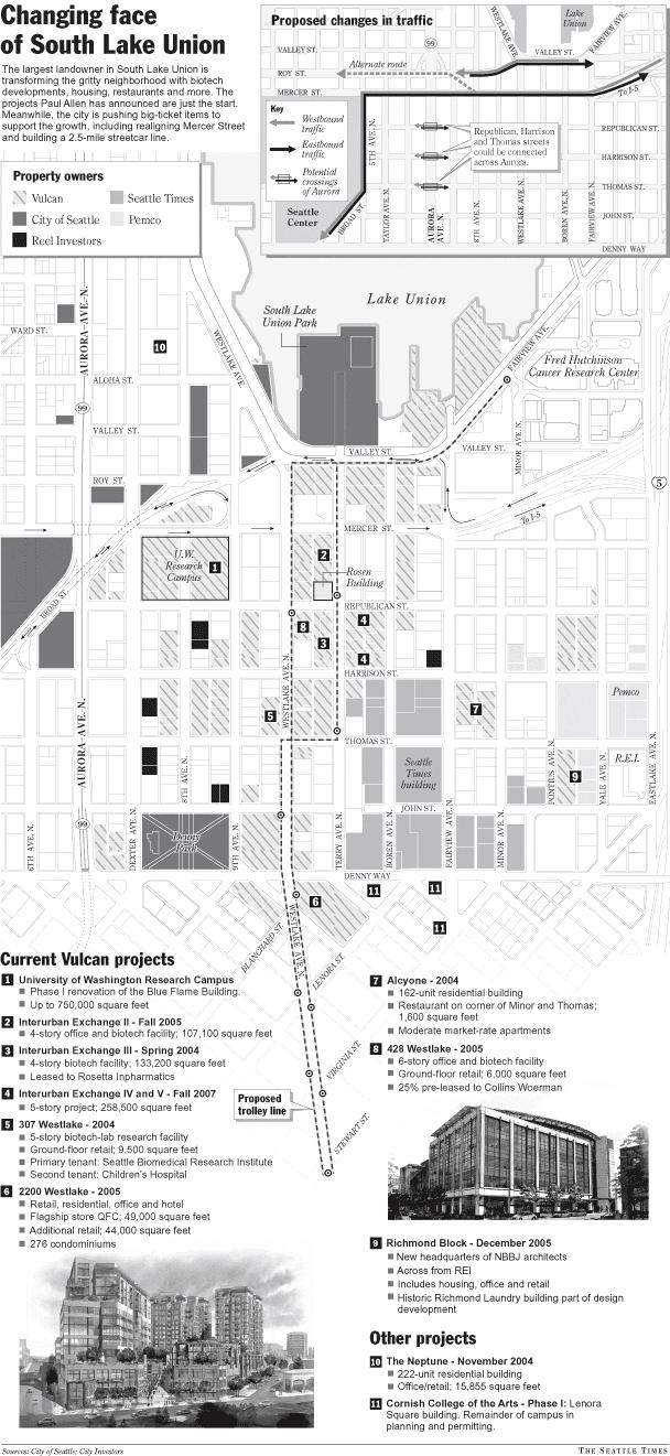 Seattle Times Created This Map of Properties and Plans for South Lake Union. This first map shows Vulcan's holdings as of Spring 2004. The map which follows this first one, shows Vulcan's additional land holdings recently purchased (June 14, 2004) from the Seattle Times at a cost of $31 million click here to jump to that map